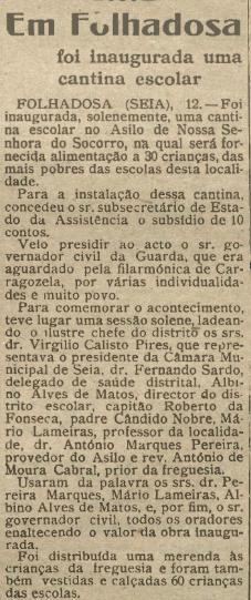 A cantina escolar de Folhadosa instalada no Asilo de Nossa Senhora do Socorro foi inaugurada em Junho de 1949. A notícia vem publicada na Comarca de Arganil de 17 de Junho de 1949.